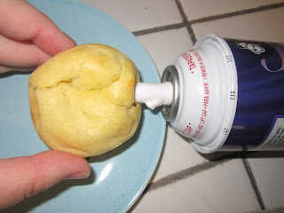 When the come out of the oven, let them cool a bit before filling. And yes, traditionally they're full of marscapone cheese, but we're talking 13 year olds. I thought they might appreciate some plain ol' whipped topping from a can.